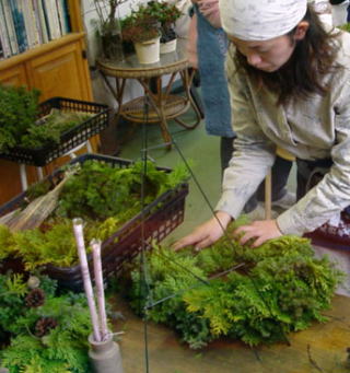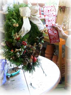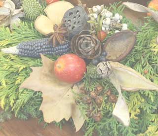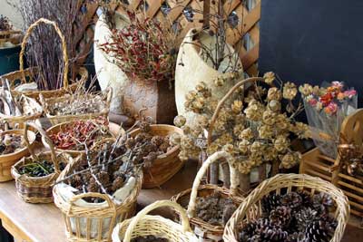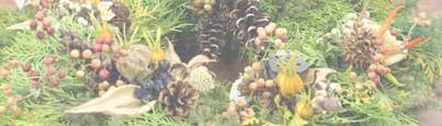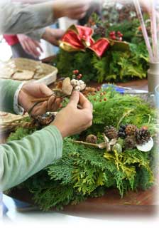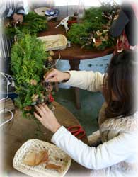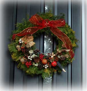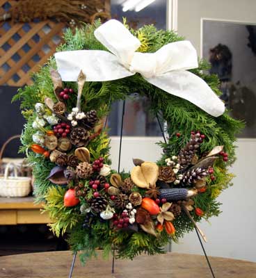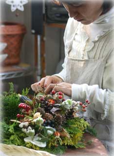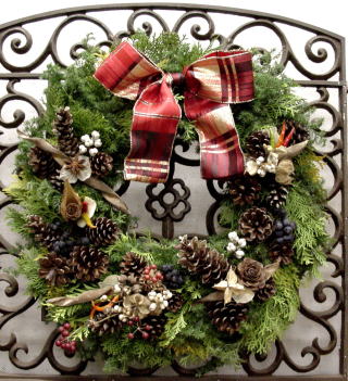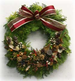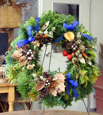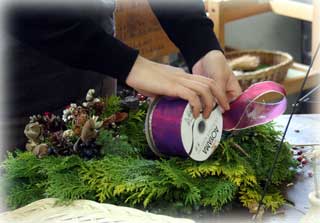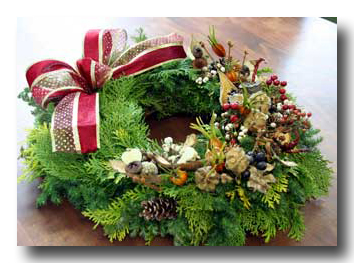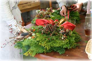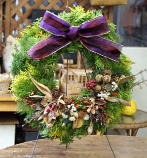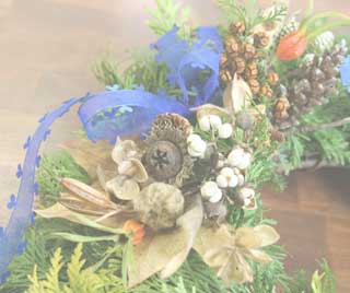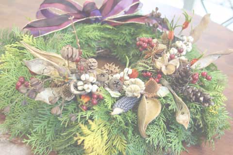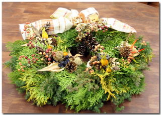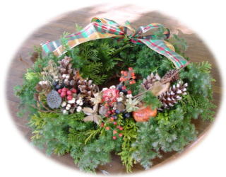 自然の樹の香りが楽しめる3種類のコニファーの枝をベースにし、お好みでマツボックリや野バラなど木の実をあしらい、お好きな色のリボンを結んで仕上げます。